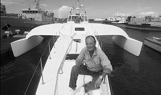 Arrivée à Tahiti du trimaran à moteur "Ocean Alchimist" de Olivier de Kersauson. Long de 27 mètres, capable de naviguer à 30 nuds, il a réalisé la traversée Panama-Tahiti (8500 kilomètres) en 15 jours. Olivier de Kersauson propose "Ocean Alchimist" pour le tournage du film sur Tavae le naufragé tahitien qui doit être tourné au large de Tahiti, une production subventionnée par le Territoire. (ph. ATP)
