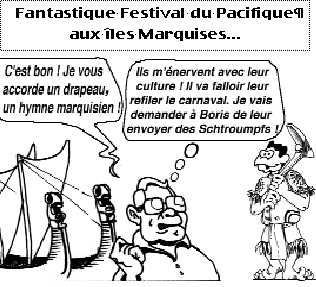 Oui, le vieux sage marquisien paré d'un simple collier de noix qui nous souriait silencieusement depuis le marae de Hatiheu ne rendait que plus pitoyable l'image qui s'enchaîna sur l'écran, celle de cette dame parée d'un collier de perles noires de plusieurs millions et qui "blabottait" comme une mitraillette avec sa voie criarde en exhibant fièrement de pauvres jeunes coiffés de masques de Mickey et Donald. Mon Dieu ! Que le schisme entre le monde urbain de Tahiti et le reste du Territoire s'est alors avéré profond, Ô combien le type de société "MacDo-Disney" que veulent imposer nos dirigeants dévoila son aspect sinistro-comique ! Car l'ambiance du carnaval de l'année précédente n'était pas au rendez-vous, les chars étaient tristes et sans imagination, une joie quelconque tout à fait absente : la foule, silencieuse, presque avec un Ïil hostile, regardait ce coûteux défilé voulu par les politiques et financé par la France avec des fonds destinés aux "animations de quartier" dans le cadre des Contrats de villes.