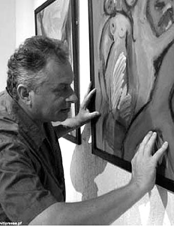 Arrivé en Polynésie voici treize ans, le peintre aussi poète et musicien Alain Simon a fait son exposition intitulée «Dans l'il de Mata» avec 57 toiles de style abstrait tournant autour du thème du monde de la nuit. (ph. Tahitipresse)