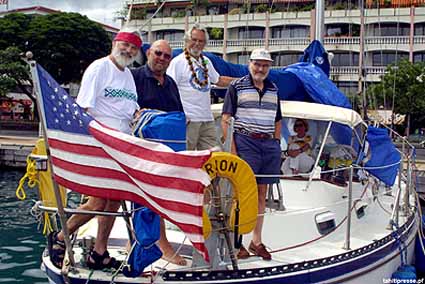 Quatre aventuriers retraités et membres du Yachting Fellowship Rotary dont la moyenne d'âge est de 75 ans en provenance de Honolulu (Hawaii), ont fait escale à Papeete après 21 jours de mer. Donald Rudd, 72 ans, Herman Allerstorfer, 77 ans, Peter Pohl, 74 ans et le capitaine du voilier Max Besenbruch, 79 ans, sont repartis visiter les îles Sous-le-Vent, l'archipel des Tuamotu et celui des Marquises. (Photo Tahitipresse)