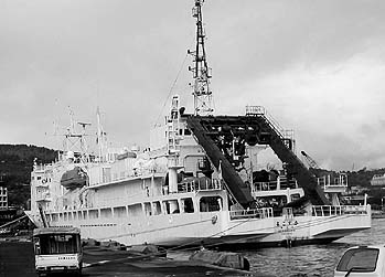 Visite d'un grand navire de recherches japonais. Il est spécialisé dans la pose et l'entretien des balises émettrices au fond de l'océan pour la recherche des phénomènes sysmiques. Ph. TPM