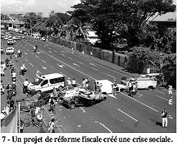 Fin novembre et début décembre ont vu la ville de Papeete prise en otage par des barrages installés par des syndicats essentiellement de fonctionnaires, rémunérés par l'Etat, qui n'acceptent pas le plan de réforme fiscale « autaeaeraa » (solidarité) du gouvernement Temaru. Ce plan, en soi, semble cohérent s'il est appliqué à la lettre (lire p. 10) et il a le mérite de vouloir sortir d'un système qui exacerbe l'injustice sociale depuis 40 ans. Il est évident que le gouvernement Temaru, composé de ministres uniquement issus du douillet cocon de la fonction publique, n'arrive toujours pas à vraiment cerner la réalité du pernicieux héritage que lui a laissé son prédécesseur : malgré des initiatives audacieuses et onéreuses visant à "booster" le tourisme (Air Tahiti Nui, hôtels défiscalisés, paquebots) le résultat a été maigre, voire nul, le nombre de touristes ayant baissé dans un marché mondial en expansion. La perle, mal gérée, stagne depuis cinq ans et la pêche est en crise grave car la ressource a disparu de nos eaux. La boulimie d'un secteur public surrémunéré, les investissements publics souvent motivés par la recherche de prestige et la distribution de subventions clientélistes ont créé une économie artificielle, assistée ou le développement durable n'est que langue de bois. Ce système économique, nommé par certains « capitalisme des Mers du Sud », basé sur la traite de toute les mamelles de subventions possibles (métropole, U.E.) alliée à la consommation sans production, sert surtout à enrichir l'oligarchie proche du pouvoir local, les fonctionnaires, et à prolétariser la grande partie de la population qui uvre hors de la « bulle », nom du secteur économique où gravitent les « nantis ». L'insertion sociale à Tahiti consiste à obtenir un poste dans la fonction publique, de s'assurer un marché public ou de s'établir une rente de subvention.