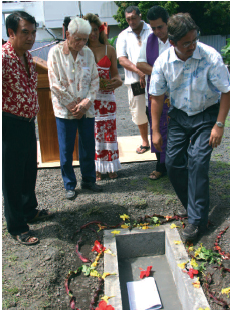 Pose de la première pierre d'un nouveau bâtiment administratif pour l'assemblée territoriale. Coût : 710 millions Fcfp (6 millions d'euros) ! Plus il pleut à Tahiti, plus l'administration pousse ! (ph. TPM)