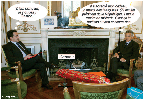 Dans les grands pays modernes "normaux", une société civile dynamique joue le rôle de rempart contre les effets d'une société politique qui se structure de plus en plus autour d'un pouvoir exécutif fort, pour ne pas dire despotique. Or à Tahiti la société politique s'est retrouvée tenant aussi en main le contrôle de la société civile car le moteur essentiel de la micro-économie marchande locale est basé sur les transferts de métropole et sur l'octroi de marchés publics, tous deux contrôlés par le politique. C'est cette toute puissance du gouvernement (similaire à celle des pays africains) qui non seulement glorifie au-delà du raisonnable la société politique, mais lui donne une impression de pouvoir absolu qui la mène à certaines dérives. Une impression de pouvoir qui peut mener à la mégalomanie lorsqu'elle profite du soutien inconditionnel et de la protection complice d'un gouvernement central à Paris que l'on a réussi à le convaincre que l'on est soit le « seul rempart contre l'indépendance » soit le « garant » d'apporter les députés du territoire à une majorité. Tout alors, même la justice, se transforme en rapport de force guidé par des politiciens, souvent de lointaines personnes qui ne connaissent rien aux réalités locales. Peu comprennent que cela puisse vite devenir désastreux pour un petit pays où tout est plutôt transparent.