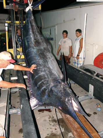 La famille Wong,  pêcheurs de Farepiti (Papeete), a rapporté un marlin (espadon) de 362 kilos. Il leur fallut le découper pour pouvoir le peser. (Ph. TPM)