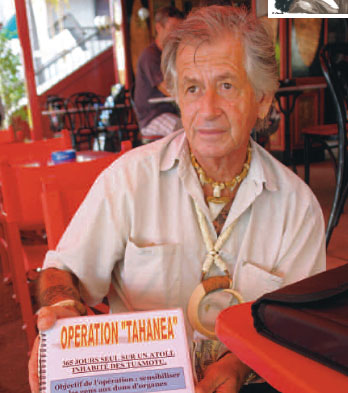 Francis Cazeau, greffé du coeur en 2004, est parti  (avec 500 kilos de vivres et matériel) vivre un an en solitaire,sur l'atoll inhabité de Tahaena pour sensibiliser les populations sur la nécessité du don d'organes. (Phs TPM)