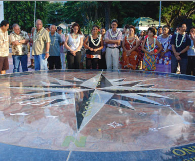 Inauguration, devant l'assemblée de Polynésie française, dâune rose des vents toute en marbre, œuvre des élèves du lycée Saint Joseph de Punaauia. Elle indique les directions des vents en tahitien comme en français. Le député-maire Michel Buillard et le président de l'assemblée Philip Schyle espèrent que la rose des vents aidera les politiques locaux à « suivre le bon cap ». (Ph. TPM)