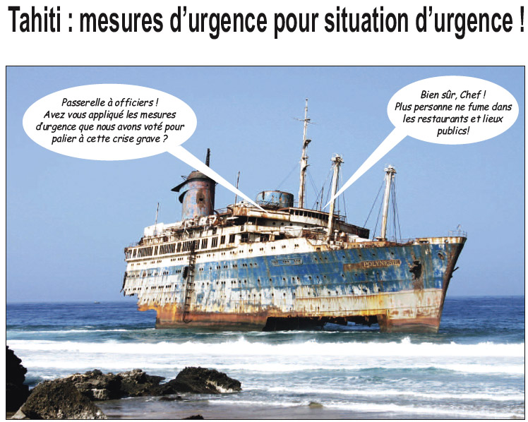 Mais encore, certainement plus grave, le gouvernement et les autorités continuent à maintenir leur train de vie, de plus en plus perçu comme étant scandaleux. Pas une réduction de salaire, pas une abolition de prime ou d’indemnité, pas de restriction sur l’utilisation de voitures de fonction, plutôt le contraire puisque l’assemblée va étudier un texte intitulé « loi du pays déterminant les garanties accordées aux représentants à l’assemblée de la Polynésie française ». Voilà qui est important !