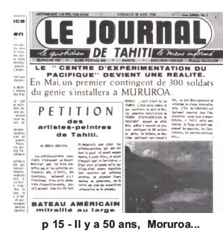 4 Clin dâœil 5 Editorial 6 Courrier des lecteurs 7 Actualité 9 Confidences 10 Actualité 12 Humour 13 Baromètre 14 Divers 15 “Cession” de Moruroa en 1964 20 Humour 21 A la cour 22 Images 23 1966 : lâAmérique latine contaminée 27 Iaorana de Simone 28 Sur la route de lâabsinthe 30 1974, un dimanche 33 The Best of LoLo 35 Hakka : agriculteur ou guerrier ? 37 Léproserie de Orofara 39 Nucléaire 41 Débat sur les retombées nucléaires 43 Nouvelle : Eri 48 Les événements du Pacifique en janvier 49 Les événements de Tahiti en janvier 50 Balises des îles |
