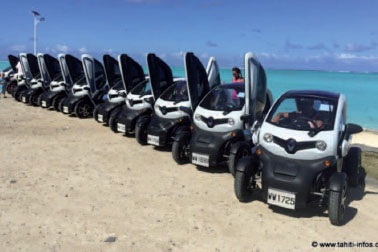 Premières voitures électriques de location à Bora Bora. Elles sont rechargées par des panneaux solaires, donc 100% écologiques.